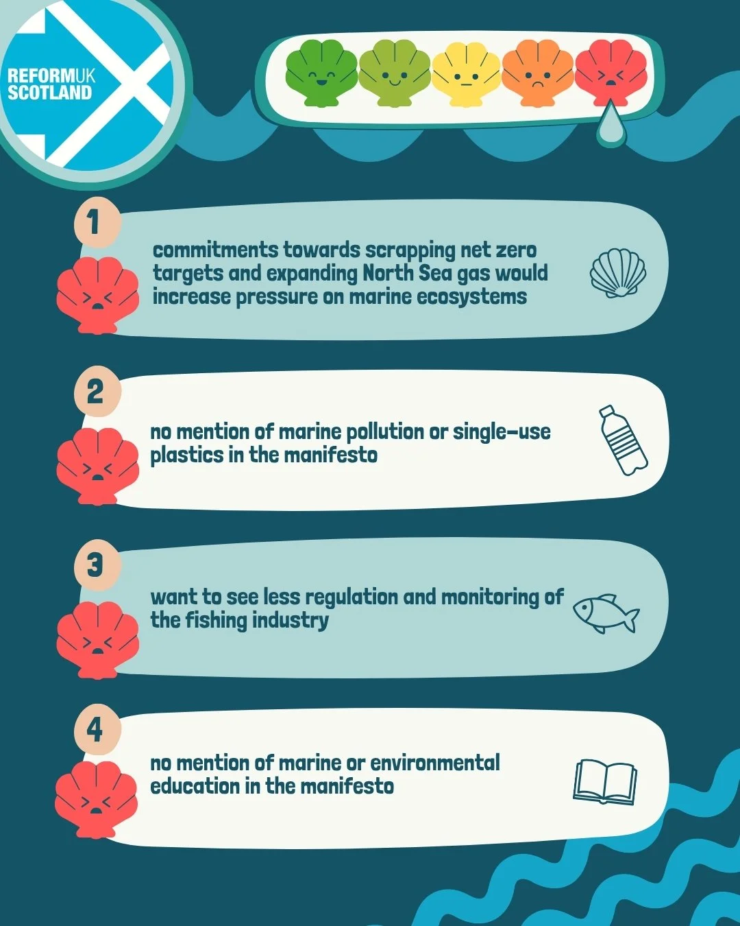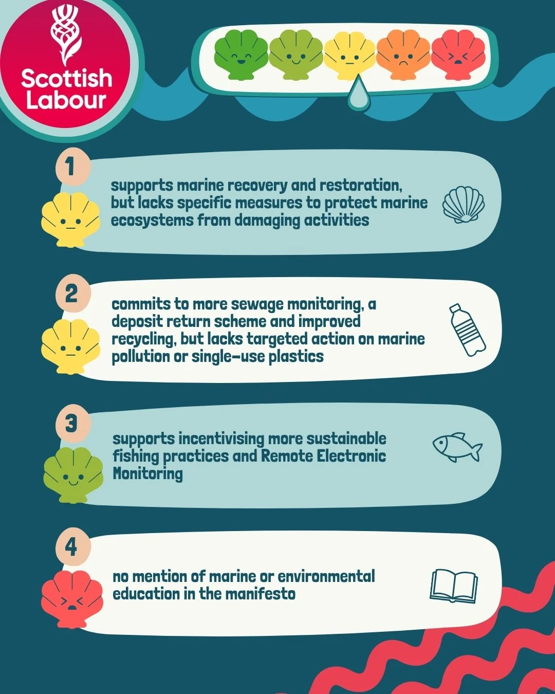 1) Labour promise to “set clear nature targets, using the powers from the Natural Environment (Scotland) Act to outline a route to nature restoration” and to "establish a Marine Recovery Fund “to deliver strategic marine and nature recovery”. However, they lack specific measures to protect marine habitats from damaging fishing practices.