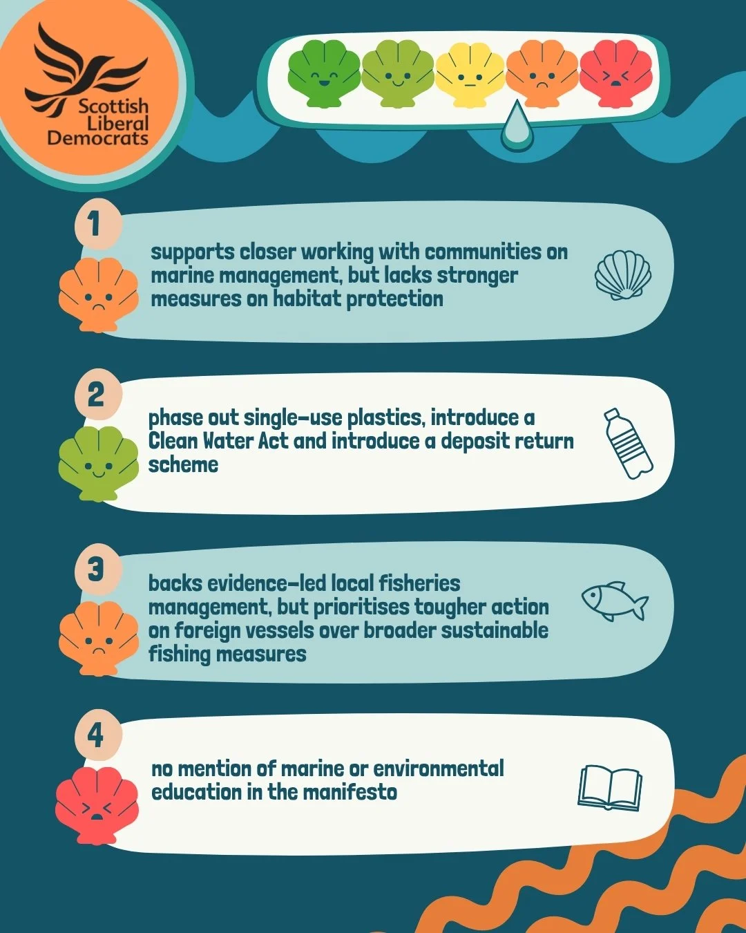 2) The Lib Dems commit to “tackle sewage dumping and introduce a Clean Water Act” and “cut down our throwaway culture, tackle plastic pollution and reduce waste” by phasing out single-use plastics, supporting repair, reuse and repurposing initiatives, introducing a deposit-return scheme, and making serious waste crime a priority. They also promise to work towards ending foreign industrial-scale gill net fishing, which is a “major source of plastic pollution in our seas - though they do not mention initiatives to reduce plastic pollution from Scottish vessels or fish farms.